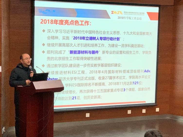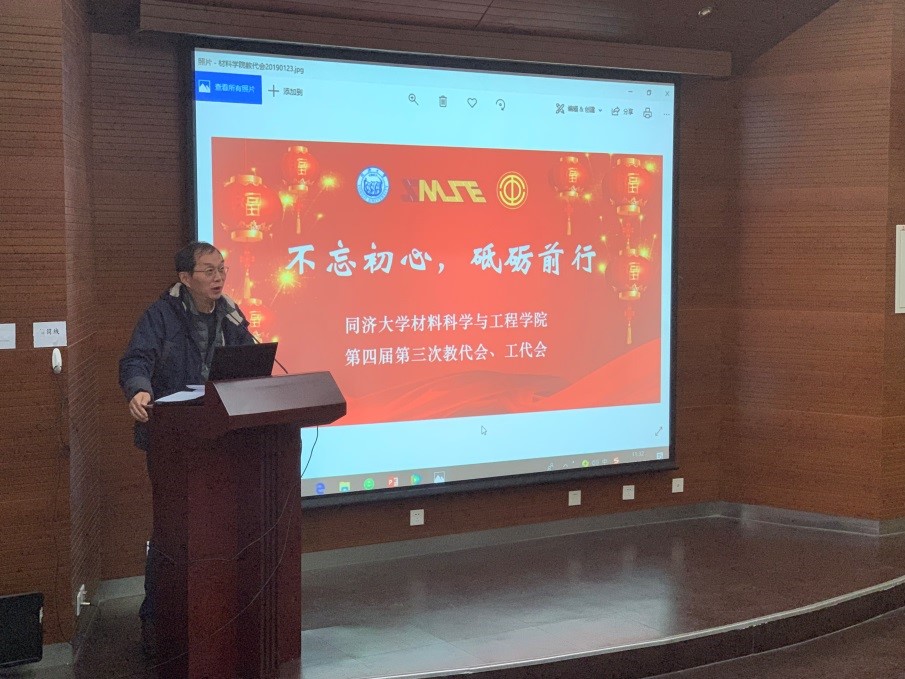 2019年1月23日,竞彩足球比分 以“不忘初心,砥砺前行”为主题在同济大学嘉定校区德才楼二楼报告厅召开了第四届教代会暨工代会第三次全体会议。材料竞彩足球比分 学科主任黄云辉、党委书记王中平、党委副书记袁华、王凌凌,,竞彩足球比分 教代会代表及列席代表共33人出席了会议。姚武、邱军副院长列席了会议.