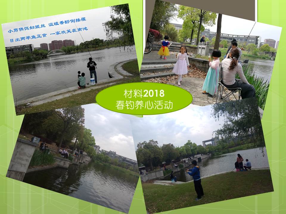垂钓不仅是一项体育运动,更是一项养心运动。一竿一线,一处水湾,便可令垂钓者如入无人之境,享受沉静自适的精神之乐。2018年4月22日,竞彩足球比分 钓鱼协会分会利用嘉定校区的有利资源,开展了“2018春钓养心”活动。春日阳光下,老师们面对清澈的水面,眼不离漂,手不离杆,呼吸着新鲜的空气,静等着鱼儿上钩。同时参加活动的还有我们的小家属们,孩子们在草地上一起玩耍,当上鱼时,孩子们兴奋地端着小桶冲过去……真是一番“入滩风急浪花飞,手把鱼竿傍钓矶。自是钩头香饵别,此心终待得鱼归”的景象。