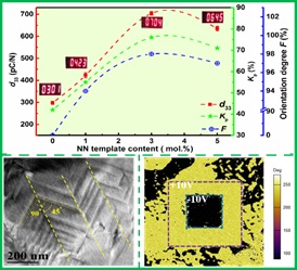 翟继卫教授课题组长期致力于无铅压电材料的研究,近期该课题组与澳大利亚卧龙岗大学张树君教授合作,通过采用织构化工艺以及对铌酸钾钠(KNN)基压电陶瓷成分的设计和烧结工艺的优化制备出具有高织构度的KNN基压电陶瓷,其压电系数d33高达~700 pC/N,机电耦合系数kp为76%,电致应变量~0.3%,同时该材料具有高的居里温度和相对优异的电/热性能稳定性。该研究发现高的压电性能主要来源于三个方面:(Ⅰ)充分利用压电晶体的各向异性设计了具有<001>取向的正交(O)和菱方(R)相共存的晶体结构,该结构具有最合适的工程畴结构,即较多的能量等价的极化矢量(Ps)数以及极化矢量和外电场方向较小的夹角θ。(Ⅱ)织构陶瓷在外电压作用下产生的高的晶格畸变是压电性能提高的本征贡献。另外,极化过程中产生的新的中间相有利于极化过程的实现。(Ⅲ)TEM和PFM表征的结果发现织构陶瓷中由于模板晶粒的引入导致的电畴尺寸的减小(纳米畴)有利于畴壁在外电场作用下的移动。