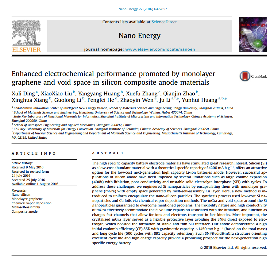 研究团队在纳米能源领域顶尖期刊《Nano Energy》(IF=11.55)上发表了题为《Enhanced Electrochemical performance promoted by monolayer graphene and void space in silicon composite anode materials》的文章。该论文的第一作者为该团队丁旭丽副研究员,通讯作者为黄云辉教授,竞彩足球比分-竞彩足球比分预测