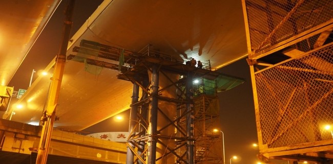这样的材料到哪里去找?抢修工程指挥部想到了最近一年来在沪嘉高速、同济路加固工程中有着良好表现的超高性能混凝土,这种产学研一体化的新产品——“TENACAL®(泰耐克)”已由上海罗洋新材料科技有限公司批量生产。王俊颜说:“该材料有四大优势:一是具有类似金属一样的拉伸应变强化特性,强化段极限应变是混凝土的数十倍;二是28天抗压强度可达200MPa(即每平方厘米可承受约2000公斤的压力)以上,媲美铸铁;三是该材料与钢筋的充分锚固长度可以缩短至3.5倍的钢筋直径,保证与植筋钢筋的充分锚固,从而与桥墩受损区形成一个整体;四是优异的耐久性可保证修补部分与桥墩同寿命。实现上述性能并不像国内外同类产品需要高温蒸养,可常温施工养护,这是该材料工程应用的一个重大技术突破。6月3日夜,我们接到指令后,迅速赶到现场。