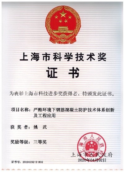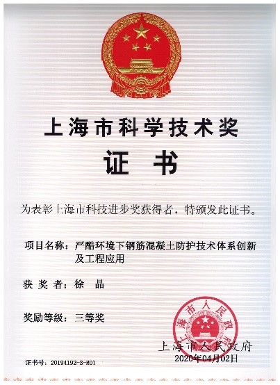 土木工程材料系徐晶副研究员、姚武教授作为主要完成人,与上海建工集团股份有限公司、南京水利科学研究院等共同合作完成的“严酷环境下钢筋混凝土防护技术体系创新及工程应用”,荣获2019年度上海市科技进步三等奖。