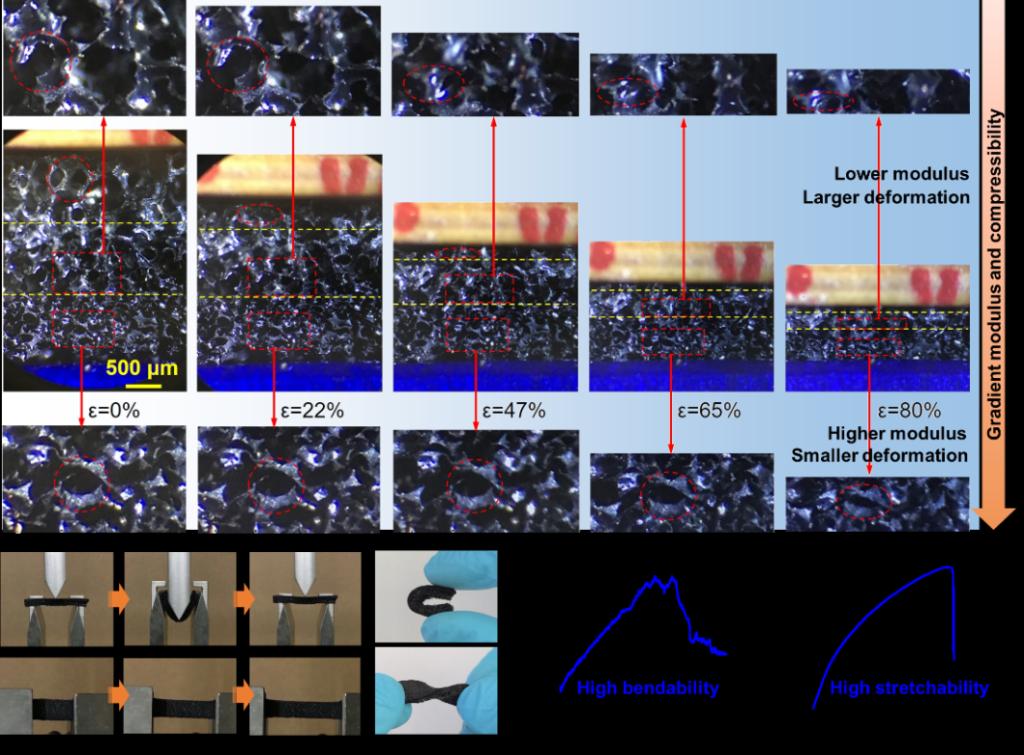 鉴于此,竞彩足球比分 祖国庆课题组采用溶胶-凝胶/热压/冷冻铸造/常压干燥的新策略,构建了具有梯度模量多孔结构的可拉伸、超弹性还原氧化石墨烯(rGO)/聚氨酯(PU)纳米复合气凝胶(图1),实现了超宽响应范围柔性压敏电子器件。相关研究成果以“Bioinspired gradient stretchable aerogels for ultrabroad-range-response pressure-sensitive wearable electronics and high-efficient separators”为题发表在Angew.Chem.Int.Ed.上,并被选为VIP论文。