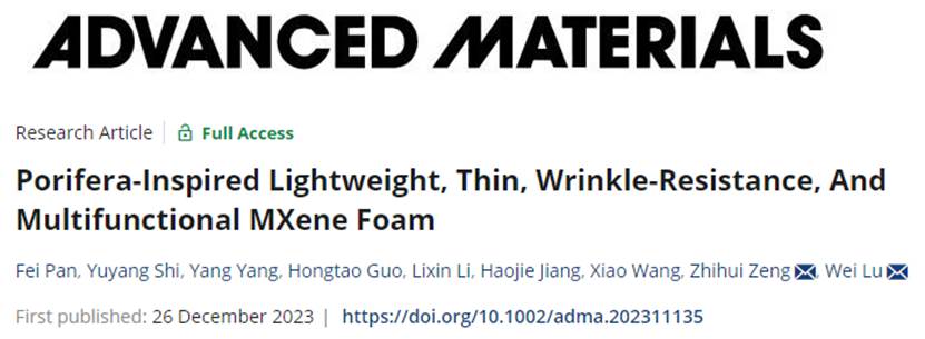陆伟教授课题组的研究论文“Porifera-Inspired Lightweight, Thin, Wrinkle-Resistance, And Multifunctional MXene Foam”,课题组博士生潘飞为文章第一作者。