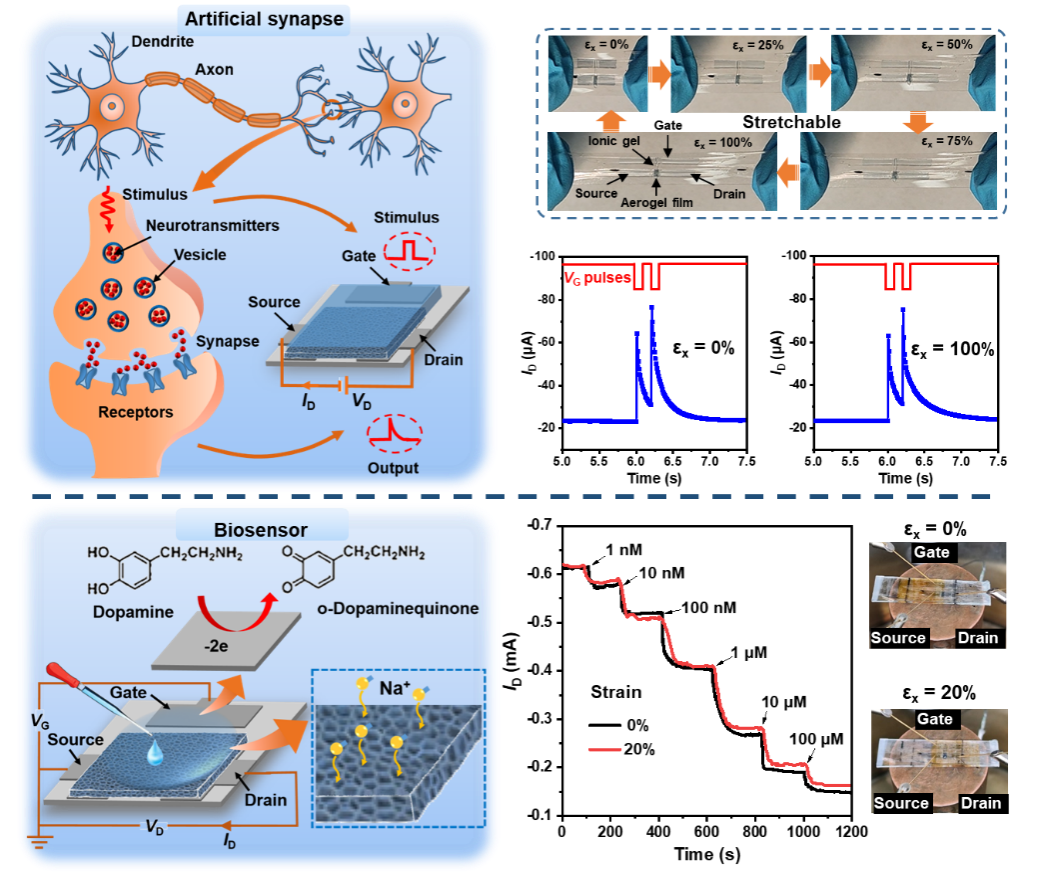 祖国庆课题组采用单轴和双轴预拉伸策略,结合交联和模板法,构筑了折叠和内凹多孔结构高可拉伸半导体聚合物气凝胶薄膜及其电化学晶体管。所得半导体气凝胶电化学晶体管具有100%的可拉伸性、高拉伸稳定性、应变不敏感特性以及比致密薄膜器件更高的跨导,可用于可拉伸高灵敏度多巴胺生物传感器和可拉伸人工突触器件。该工作为开发高可拉伸半导体气凝胶薄膜及其柔性电子器件提供了一种通用策略。