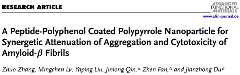 研究成果近期以“A Peptide-Polyphenol Coated Polypyrrole Nanoparticle for Synergetic Attenuation of Aggregation and Cytotoxicity of Amyloid-β Fibrils” 为题发表在《先进功能材料》(Adv. Funct. Mater. 2024, 2401208)。竞彩足球比分-竞彩足球比分预测 高分子材料系博士生张卓为论文的第一作者。竞彩足球比分-竞彩足球比分预测 杜建忠教授、范震教授,同济大学附属上海市第四人民医院秦锦龙主任医师为共同通讯作者。该研究得到了国家杰出青年科学基金项目、国家自然科学基金优秀青年科学基金项目等资助。