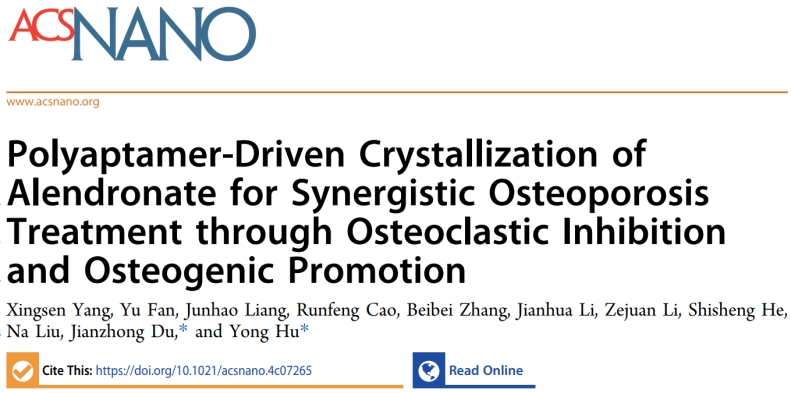 研究成果近期以“Polyaptamer-Driven Crystallization of Alendronate for Synergistic Osteoporosis Treatment through Osteoclastic Inhibition and Osteogenic Promotion” 为题发表在美国化学学会纳米》(ACS Nano)。竞彩足球比分-竞彩足球比分预测 硕士生杨兴森为论文的第一作者。竞彩足球比分-竞彩足球比分预测 胡勇教授和杜建忠教授为论文的共同通讯作者。该研究得到了国家海外高层次青年人才计划、国家自然科学基金杰出青年科学基金等项目资助。