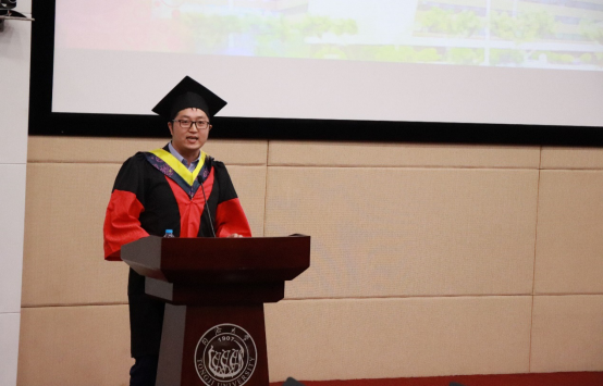 81级校友张量学长为同学们送上毕业寄语,学长满怀深情地追忆起同济求学时的“学生二食堂” 、“工程实验馆”,并感慨于母校的巨大变化。他以英国攻读博士学位的留学经历和职业生涯的体会,勉励同学们在新时代的环境下适应变化、不断学习新知识,苟日新、日日新、又日新。