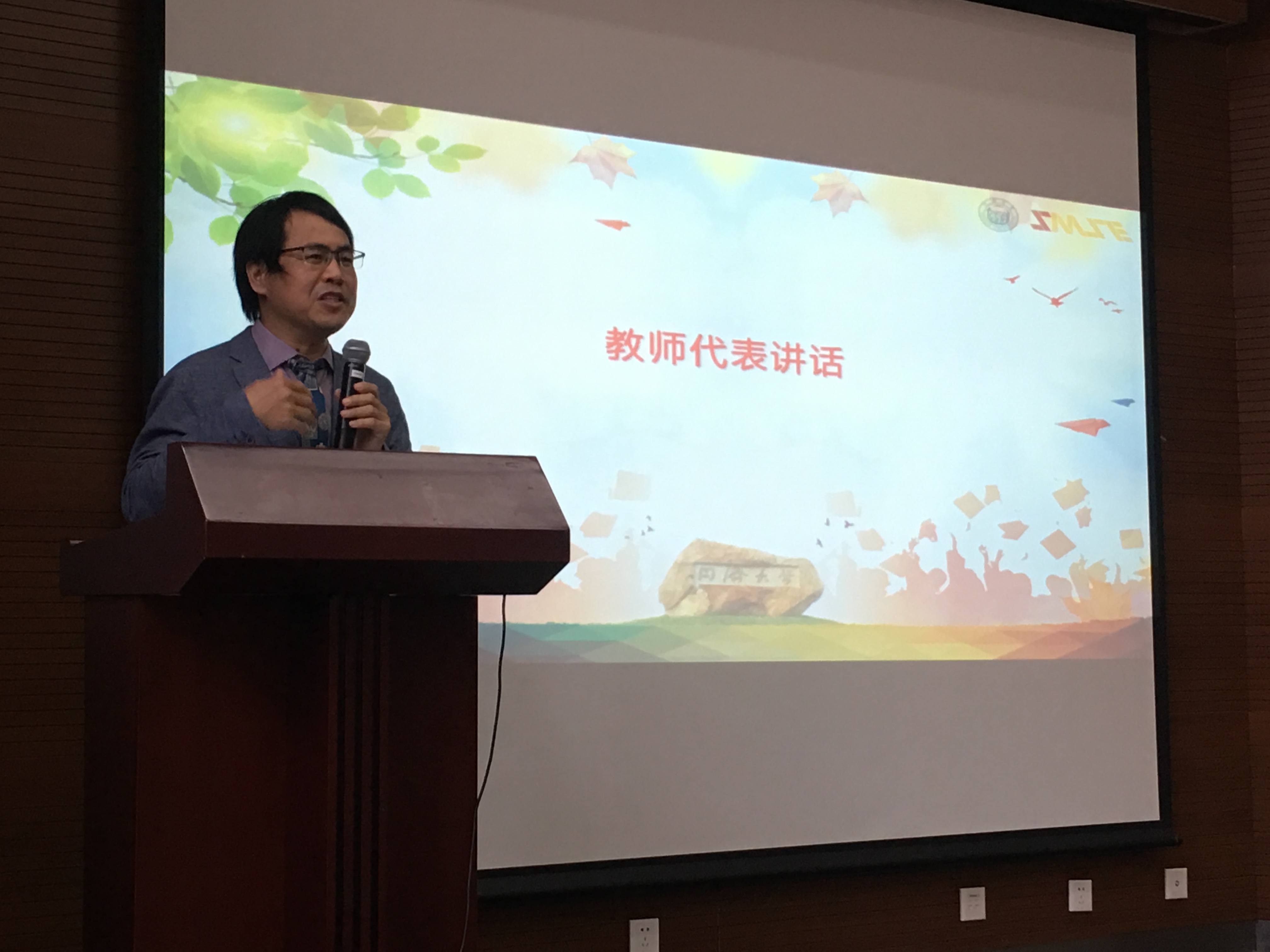 随后,教师代表任天斌老师讲话。他为同学们四年来的成长感到欣喜,勉励同学们:材料人要有材料的思维,材料人的理念和材料人的担当。材料的性能是由材料的微观结构决定的,只有研究透他的微观组成才能全面把握材料的特性。同样的,材料人要学会研究问题的本质,从最基础的地方把握问题,才能在未来的学习工作中解决问题。材料人还要有胸怀天下的理念和担当,努力为国家的发展做出自己的贡献。