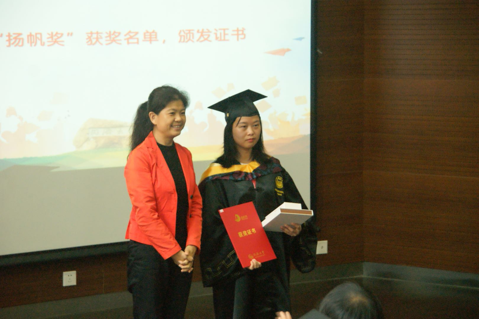 王凌凌老师宣读了“扬帆奖”获奖名单,并向获奖代表邹佳慧颁发获奖证书和纪念品。