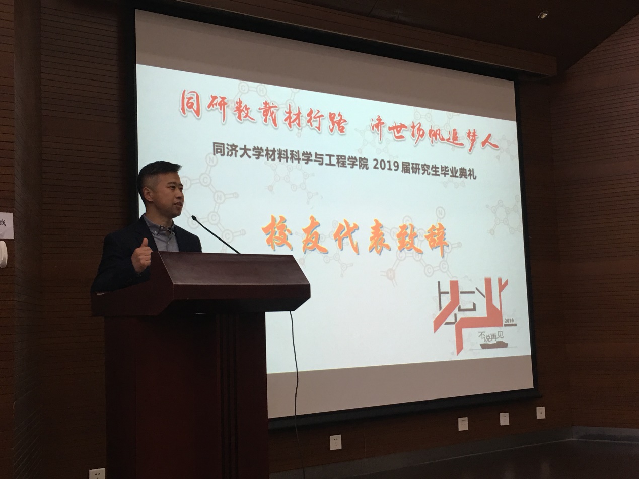 02届博士生校友俞海勇为同学们送上毕业祝福,学长深情地回忆自己在同济求学时的苦与乐,以及如何使用在同济大学获得的知识技能解决岗位上的各种问题。并感慨于母校的巨大变化,以及毕业学子的出类拔萃,以及为大家提出了三点期盼共勉。一是要常怀好奇之心,长做有心之人,持之以恒的学习,跟上时代;二是对事业的专注与坚守;三是注重团队精神与跨界思维。只要时刻秉承着这些理念,就一定能够在未来的生活中乘风破浪。俞海勇校友现身说法,赢得同学阵阵掌声。