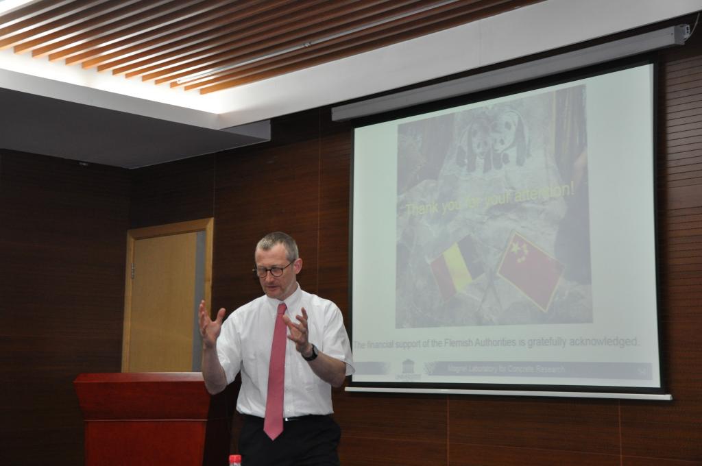 Geert De Schutter教授系列讲座主题是混凝土结构损伤及破坏,讲座全面系统介绍混凝土结构损伤劣化方面的研究成果,从损伤破坏发生的机理及材料组成设计方面进行了细致分析,介绍世界范围内一些重要案例,还积极分享了欧盟在混凝土耐久性研究领域相关的基本政策、标准、行业现状及未来发展规划。讲座结束后,Geert De Schutter教授还介绍了根特大学Magnel混凝土研究实验室主要平台研究条件、科研工作及成果,结合他对土木工程防灾国家重点实验室、先进土木工程材料教育部重点实验室及同济大学相关研究平台的参观认识,提出了许多建设性设想,参会老师、同学也进行了积极互动,取得了良好的效果。
