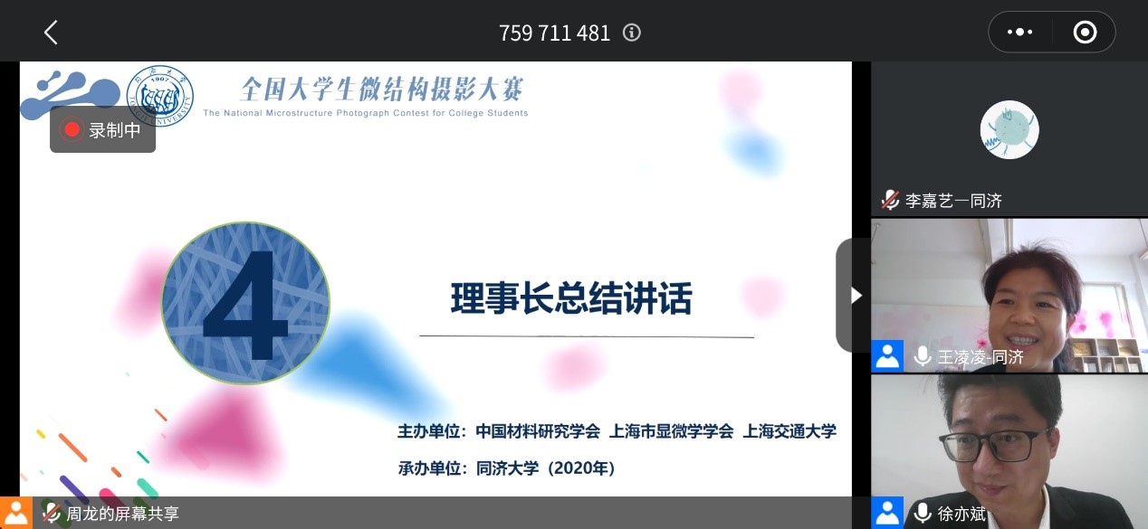 大赛秘书长徐亦斌受曾毅理事长的委托发表总结讲话,希望各理事单位持续引导材料专业学子培养学科兴趣,提高学生和导师的学术积极性,挖掘和培养材料研究后备人才,为学科发展贡献力量。他感谢大家的热情参与和长期支持,肯定了同济大学作为承办方对2020年全国大学生微结构摄影大赛做出的诸多努力,感谢同济大学在疫情期间勇于担当,负责承办此次大赛,预祝明日大赛决赛圆满成功!最后,各理事单位再次预祝大赛决赛圆满顺利举行。