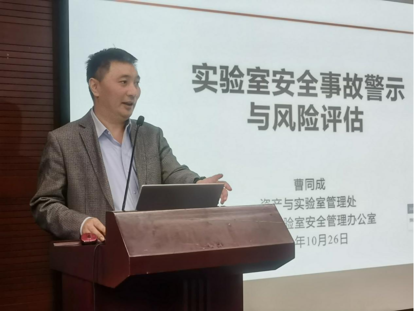 校资产处副处长曹同成作题为《实验室安全事故警示与风险评估》的报告,从《教育部关于加强高校实验室安全工作的意见》、安全事故警示、风险评估体系三个方面深入浅出向竞彩足球比分