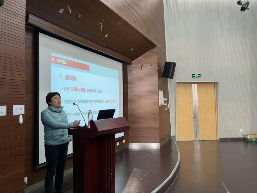 党委副书记、纪委书记袁华教授作了《人事政策及案例警示教育》宣讲。袁华老师首先对将从2021年12月1日起施行的《同济大学教职工考勤及请假管理规定》进行了解读。又带领全体教师学习了同样将从2021年12月1日起施行的《同济大学教职员工处分暂行规定》、《同济大学教职员工处分暂行规定实施细则》。袁老师要求广大教职工要进一步贯彻落实相关文件精神,对师德师风失范案例、违纪案例引以为戒,牢固树立大局意识、全局意识和底线思维,严格遵守学校各项规定,积极造就政治素质过硬、业务能力精湛、育人水平高超的高素质教师队伍。