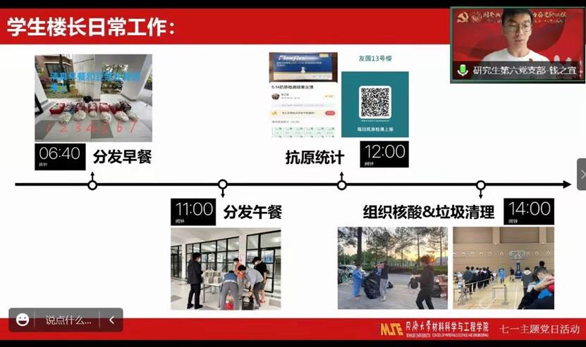 研究生第六党支部委员——嘉定校区友园13号楼学生楼长钱之宜以“像钢铁一样坚强”为题,生动讲述了自己作为一名学生楼长的战役故事。借由在疫情防控期间楼宇工作的日常,向大家展示了学生楼层长在楼宇保障中所承担的责任。同时,他分享了在工作中遇到的困难与挑战、收获与感悟。他表示:作为一名党员,我们要勇于到困境中去磨炼自己钢铁般的意志,并在困境中团结成一块坚硬的钢铁,形成万众一心无坚不摧的力量,更好地践行为人民服务的宗旨。