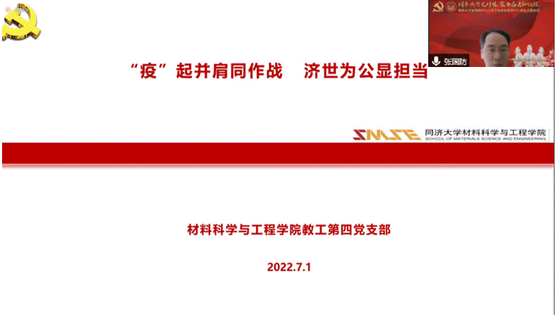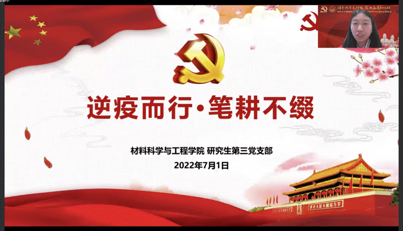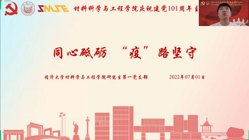 研究生第一党支部书记刘科以“同心砥砺、‘疫’路坚守”,为主题,向与会同志介绍了各学生党支部对外辐射宣传、学术讲堂以及与外校的支部互建联络合作情况等系列活动。他寄语材料学子:作为新时代青年党员,要把青春奋斗融入党和人民事业,成长为堪当民族复兴重任的时代新人,成为实现第二个百年奋斗目标的先锋力量。