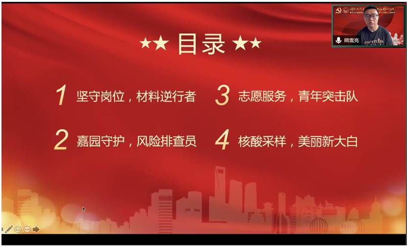 教工和学生党支部的8位代表围绕四个主题八个板块分享了自己的战“疫”故事。