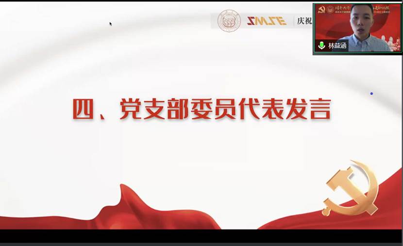 毕业班党支部委员林益涵代表即将离校的学生支委进行发言。他分享了自己成为学生党支部书记的初心和两年工作中的体会、收获与感悟,建议各位党员需要勤于学习,善于反思,脚踏实地,实事求是。作为毕业生的一员,林益涵同学祝愿各位同学以“不待扬鞭自奋蹄”的干劲、“任尔东西南北风”的韧劲践行“把论文写在祖国大地上”的同济精神,在更广阔的舞台书写更绚丽的人生篇章。