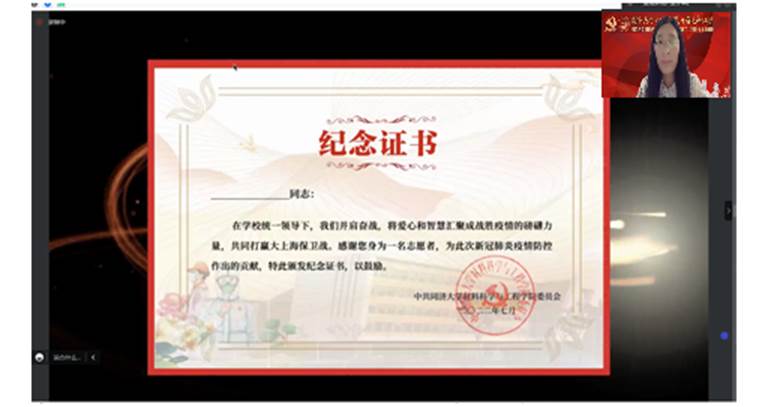党委特邀请校党委学研工部副部长王小莉为所有致力于共同打赢大上海保卫战的志愿者们“云”颁发纪念证书。王小莉副部长指出:“听到了师生的战疫故事,深深感受到了同舟共济、自强不息的同济精神,深受感染,在学校统一领导下,大家并肩作战,汇聚战疫磅礴力量,感谢每一位志愿者为此次疫情防控做出的贡献”。随后,由学生骨干杨思禹同志宣读了包含84位教工与302位学生在内的疫情防控志愿者名单。