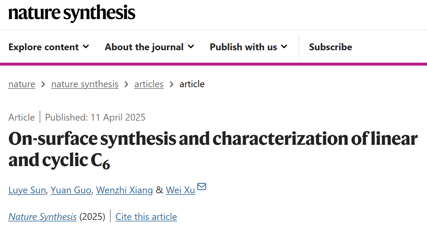 许维教授团队的研究论文 “On-surface synthesis and characterization of linear and cyclic C6”。该工作在4.7 K极端条件下通过原子制造技术,利用扫描探针显微镜的针尖进行原子操纵,可控断裂特定化学键,在NaCl/Au(111)表面上精准合成了两种全新的分子碳材料—最小的芳香性环型C6和它的同分异构体线型C6,并精细表征了其化学结构。该成果为探索分子碳材料的化学极限提供了关键实验证据。