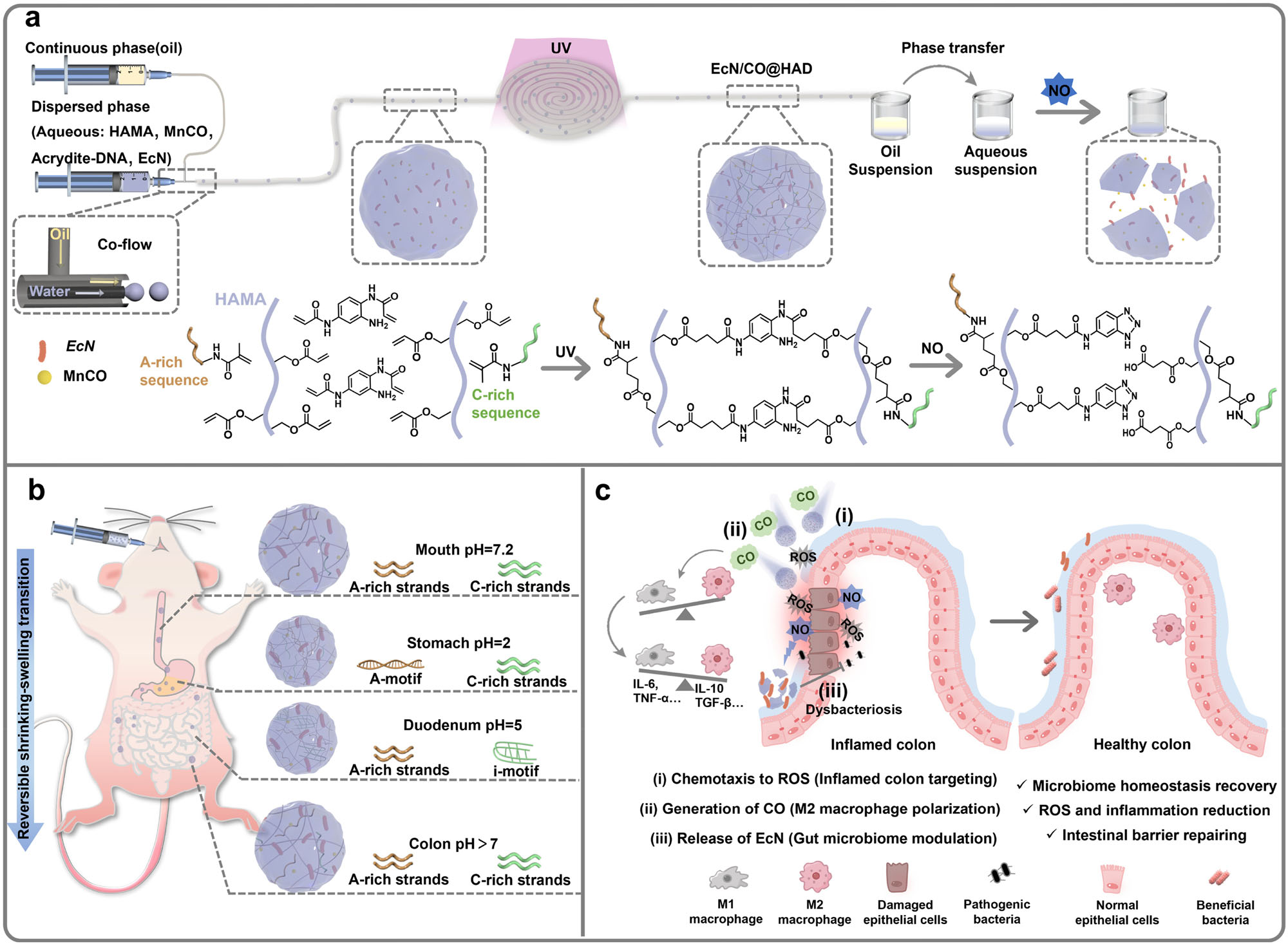 胡勇教授课题组设计一种具有酸适应和炎症趋化能力的DNA微胶囊马达益生菌递送体系。该研究团队采用液滴微流控技术制备尺寸均一且单分散的油包水微液滴,并在该液滴水相中引发丙烯酸酯改性的寡核苷酸序列交联形成微胶囊。经口服后,当微胶囊到达胃部和十二指肠时,寡核苷酸序列组装成A-motif和i-motif结构,进而提高微胶囊分子网络的交联度,以抵御H+离子体对益生菌的侵袭。当微胶囊抵达结肠后,寡核苷酸二级结构解组装为单链分子,使其交联度降低至初始水平。