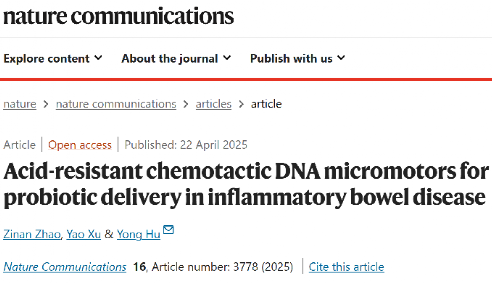 胡勇教授团队在《自然·通讯》(Nature Communications)上在线发表了题为“Acid-resistant chemotactic DNA micromotors for probiotic delivery in inflammatory bowel disease”的研究论文。