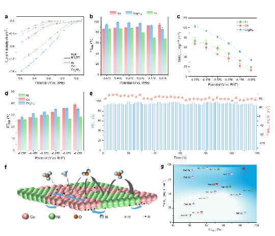 程洪飞特聘研究员团队设计了用于电催化还原硝酸盐制氨的高性能催化剂。本研究揭示了催化反应中钴和氢氧化钴相互转化的原因,并通过在钴中引入镍纳米晶构筑了Co6Ni4异质结构催化剂。该催化剂通过异质界面调控中间体的吸附、改善电子转移,抑制了低活性钴物种的积累,实现了高效稳定的催化反应。