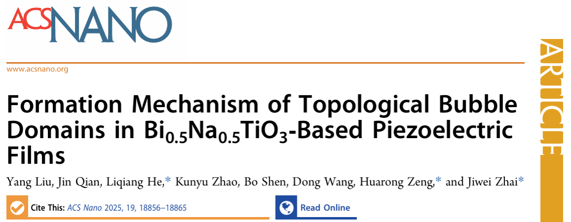 该研究成果以以“Formation mechanism of topological bubble domains in Bi0.5Na0.5TiO3‑based piezoelectric films”为题发表于《ACS 纳米》(ACS Nano)上。论文第一作者为同济大学在读博士生刘阳。通讯作者为同济大学翟继卫教授、中科院上硅所曾华荣研究员和西安交通大学何利强博士。该研究工作得到了国家自然科学基金、国家重点研发计划等项目的资助。