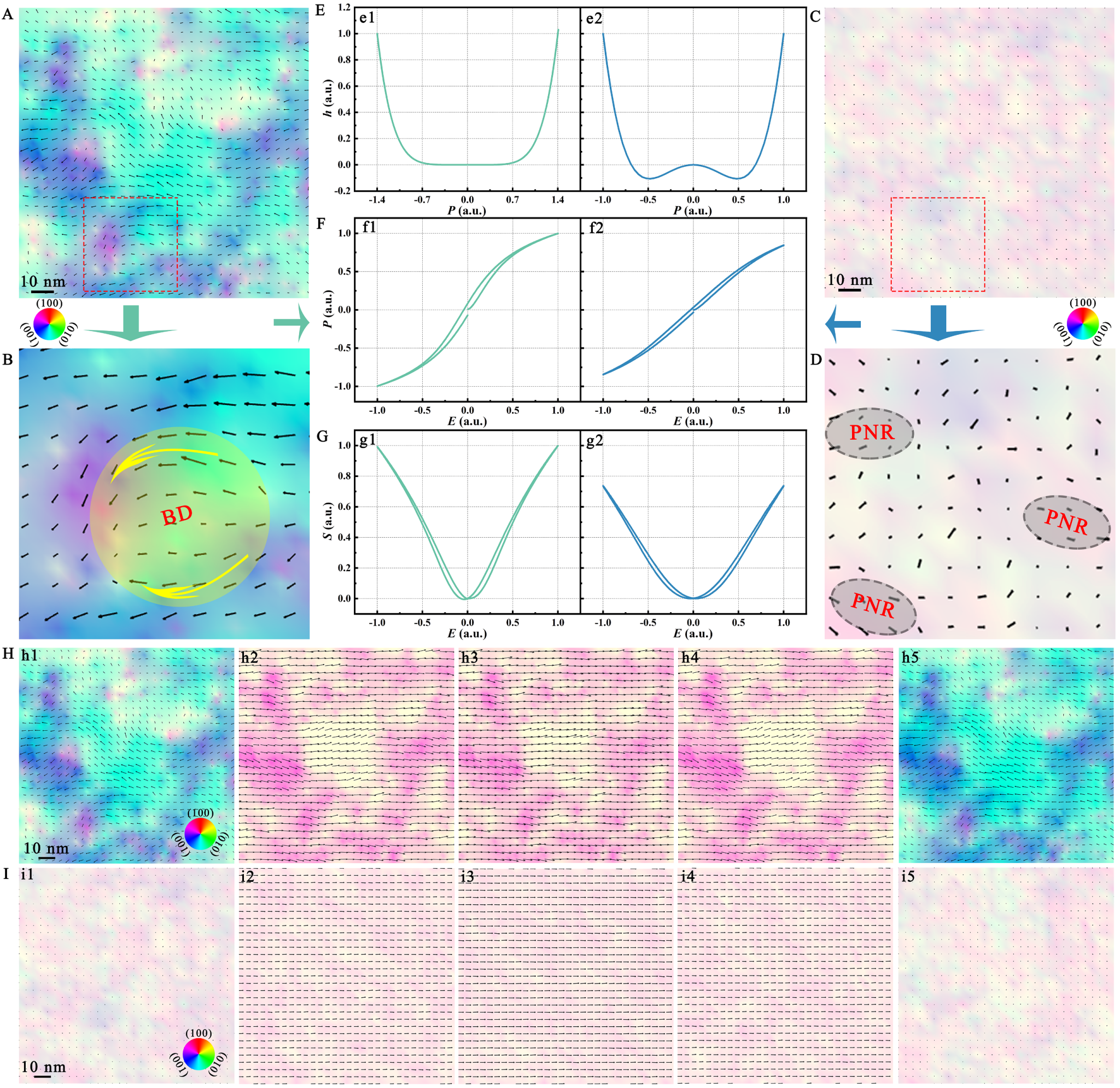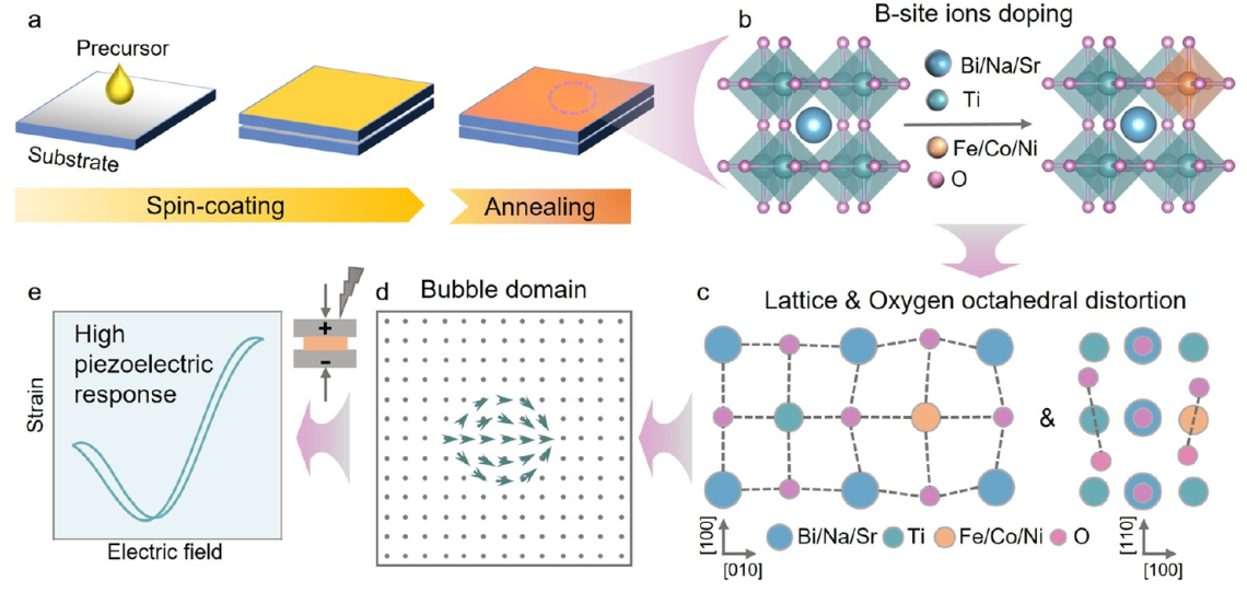 压电材料的畴结构在决定其压电/应变性能方面起着关键作用。气泡畴(BDs)对进一步增强材料的压电/应变性能方面展现出大的希望。但是理解和利用BDs来实现这一目标是一个重大的科学挑战;在无铅压电陶瓷中,铌酸钾钠基((K,Na)NbO3, KNN)压电陶瓷具有较高的压电性能和居里温度等特点,但是温度稳定性与铅基压电陶瓷还相差甚远,限制了其潜在应用;铁酸铋基(BiFeO3, BF)压电陶瓷具有优异高温压电性能,是发展下一代极端环境应用型环保电子器件的关键材料;BiFeO3-BaTiO3(BF-BT)基压电陶瓷有良好的铁电/压电性能和高居里温度展现出解决相关技术难题的潜力,但如何有效协调压电性能与热稳定性之间的矛盾仍是该领域面临的重要科学挑战。