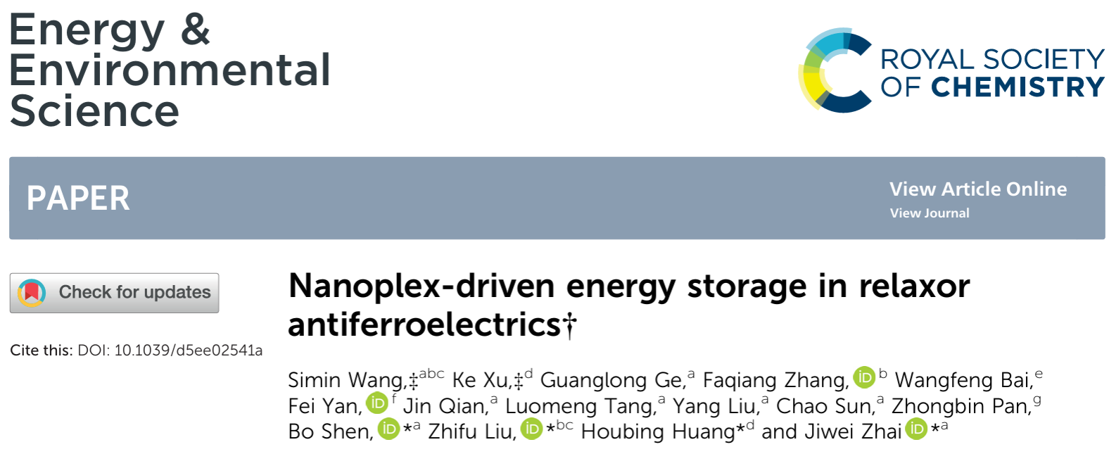 该研究成果以“Nanoplex-driven energy storage in relaxor antiferroelectrics”为题发表于《能源与环境科学》(Energy & Environmental Science)》上。论文的第一单位是竞彩足球比分-竞彩足球比分预测