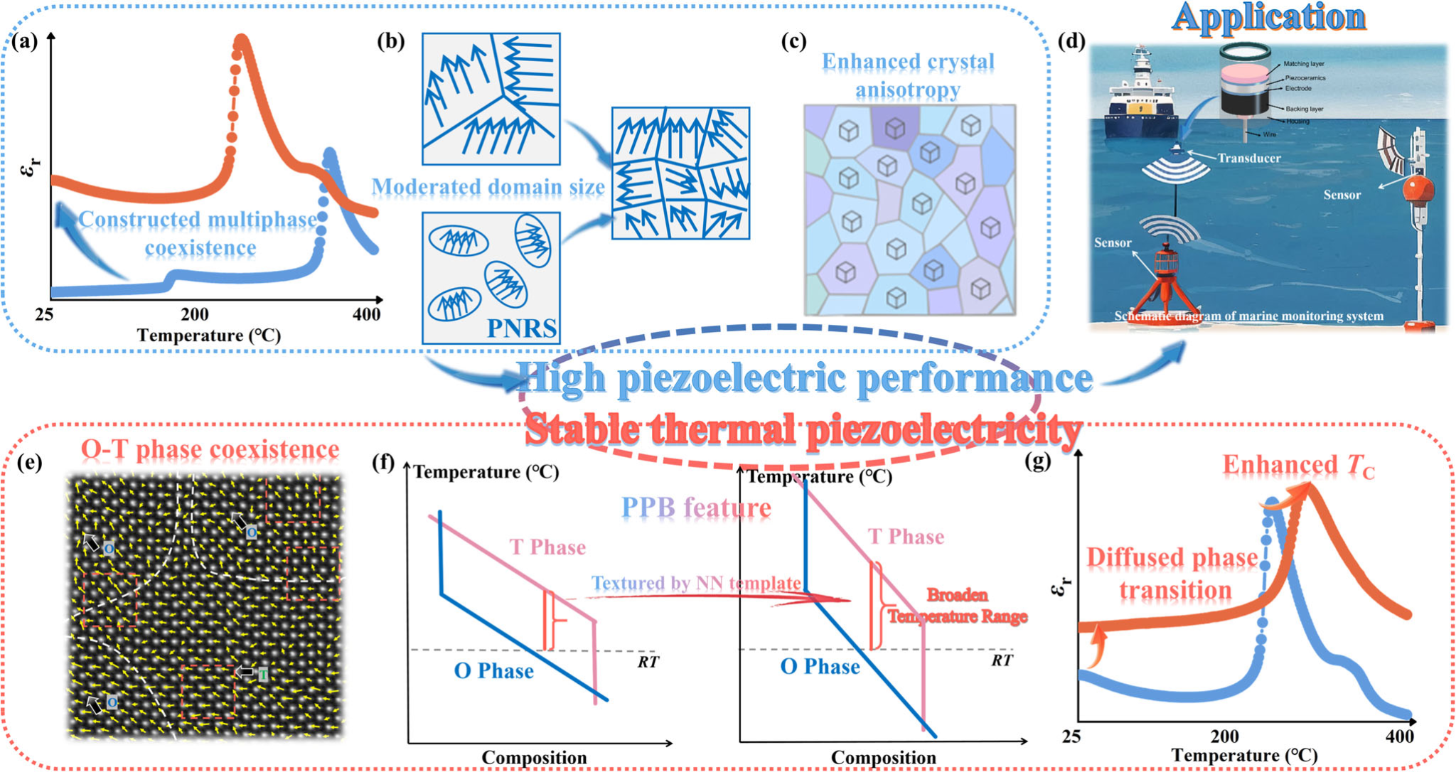 翟继卫教授研究团队提出了一种集成分调控和织构工程的双重策略,旨在重构KNN基陶瓷的相结构、畴结构、晶体各向异性和相变之间的复杂耦合。结果表明,在(K,Na)NbO3基织构化陶瓷中获得了较高的压电系数(d33~550±30 p CN-1)和逆压电系数(d33*~850 pm V-1),以及290 °C的居里温度。同时,在25-200 ° C的温度范围内,陶瓷的d33和d33*的变化率仅为3%和4%。这种在(K,Na)NbO3基陶瓷中表现出的超稳定热压电性能与商用Pb(Zr, Ti)O3基陶瓷相当。