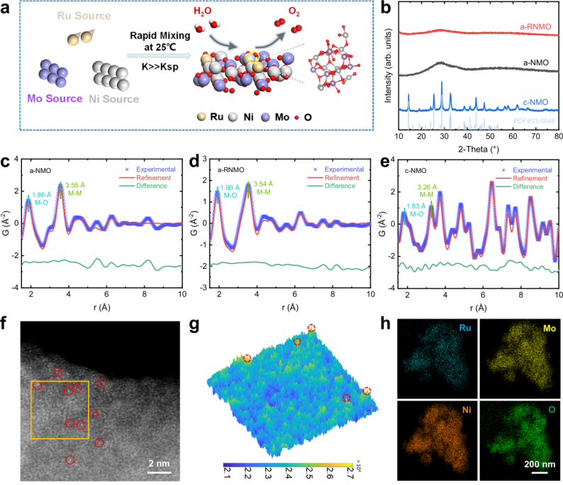 马吉伟教授团队设计了一种室温下一步过饱和共沉淀法得到锚定Ru单原子的非晶NiMoOx,该催化剂在碱性电解槽中展现出优异的应用潜力。原位表征和理论计算表明,单原子和非晶结构在电催化反应中起着至关重要的协同作用。以上研究验证了在非晶材料中锚定贵金属单原子,为贵金属催化剂取得高催化性能和经济效率之间的平衡提供了前瞻性策略。