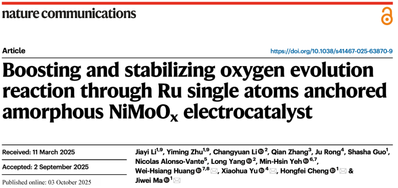 马吉伟教授团队及其合作者的研究论文“Boosting and stabilizing oxygen evolution reaction through Ru single atoms anchored amorphous NiMoOx electrocatalyst”。该研究构建了一种以非晶NiMoOx为载体锚定Ru单原子的电催化材料,为在非晶氧化物上锚定金属单原子设计高性能OER电催化剂提供了范式与依据。