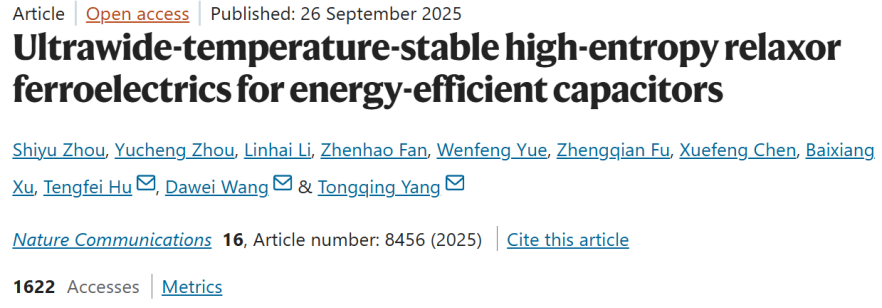 杨同青教授有关电介质储能电容器的研究成果以“Ultrawide-temperature-stable high-entropy relaxor ferroelectrics for energy-efficient capacitors”为题发表于《自然·通讯》期刊(Nature Communications)。