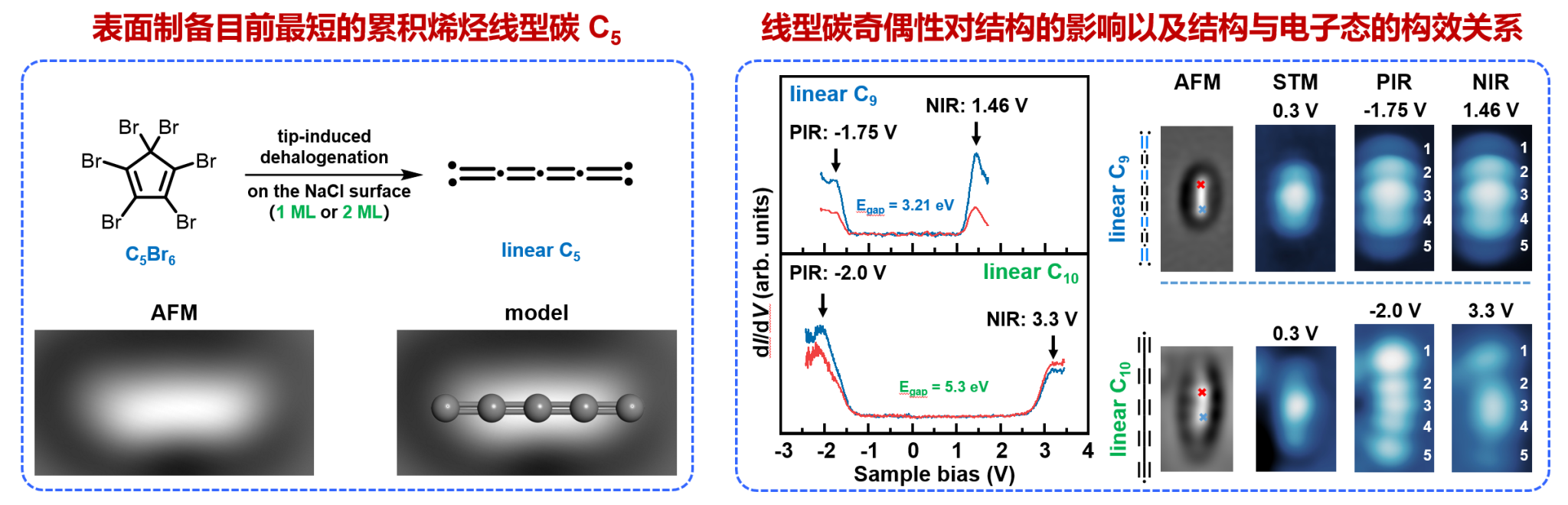 许维教授团队依托其在表面化学合成与扫描探针显微技术方面的积累,提出了基于原子操纵的线型碳精准构筑策略。研究以全溴代环戊二烯(C5Br6)为前体分子,通过针尖诱导脱溴及开环反应,在绝缘层表面上首次获得了无端基保护的线型碳C5。进一步研究发现,线型碳C5可通过针尖操纵实现定向偶联,生成不同长度的碳链(如C9、C10、C13、C14等)。研究发现,奇偶链在结构与电子性质上表现出显著差异:偶数碳链受NaCl表面诱导发生Peierls相变,形成聚炔型结构;奇数碳链保持累积烯烃特征,且其能隙明显小于相邻偶数碳链。该实验结果验证了Peierls理论在有限碳链体系中的适用性。