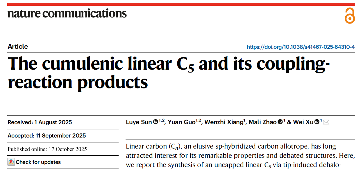 该工作不仅实现了线型碳C5的原位制备与成像,还揭示了碳链长度、奇偶性与电子结构之间的内在联系,为探索sp碳体系的结构调控、导电机理及其在分子电子学中的应用提供了依据。该策略未来有望推广至更长链乃至环型碳的精准合成,为实现碳基纳米器件的可控构筑提供全新思路。