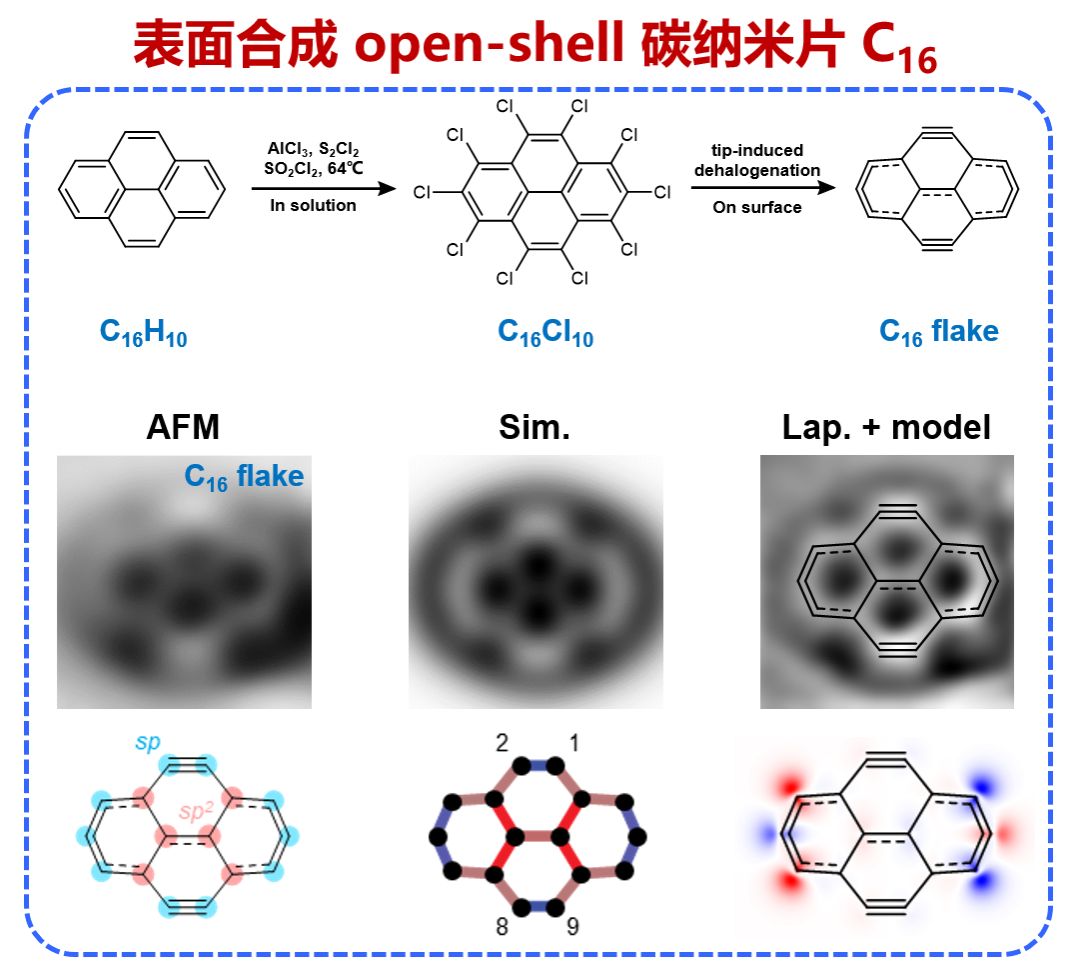 针对这一问题,许维教授团队利用低温扫描探针显微镜(STM/AFM)的原子操纵技术,以全氯化芘(C16Cl10)为前体分子,逐步去除氯原子,在绝缘层表面上获得了石墨烯片状的C16分子。理论计算表明,该分子兼具三键特征与石墨烯片段的六元环结构,属于一种全新的sp–sp2杂化型碳同素异形体。高分辨AFM成像揭示了分子中典型的三键特征位点,密度泛函理论(DFT)计算表明其基态为开壳层单线态,并在边缘区域呈现局域磁矩。