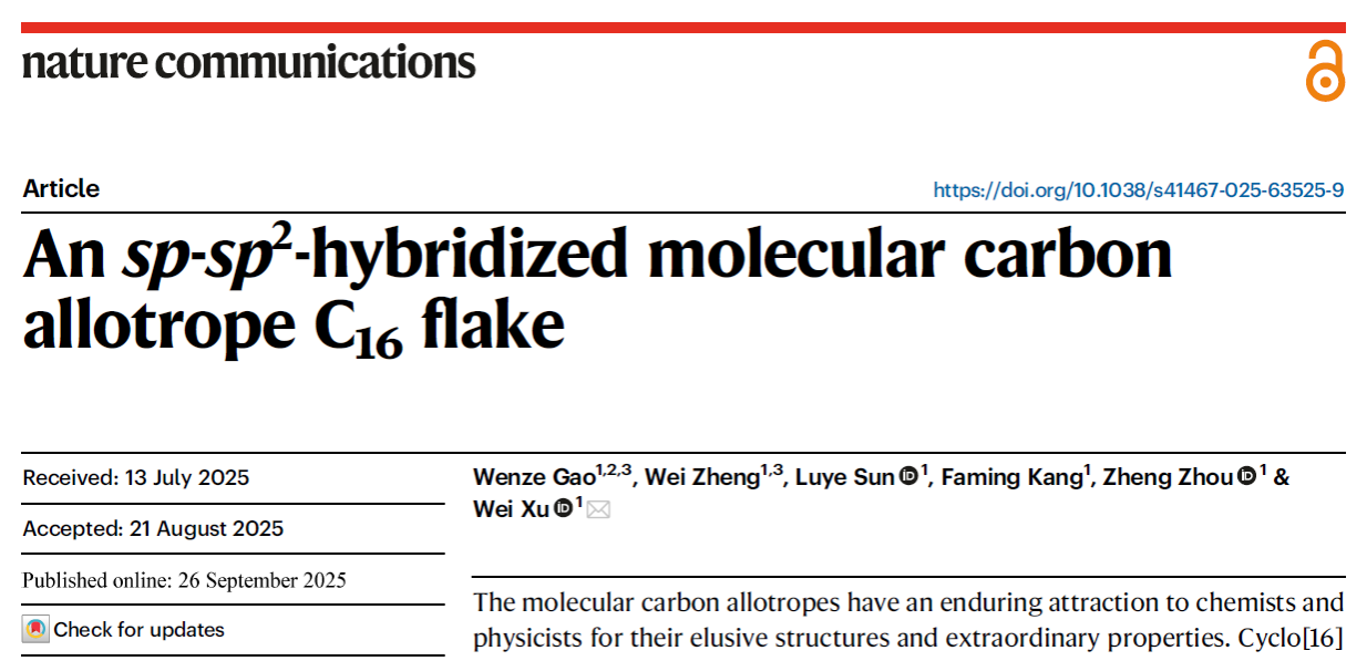 许维教授团队在新型分子碳材料研究领域取得进展。9月26日和10月17日,《自然•通讯》(Nature Communications)先后在线发表了该团队的两篇研究论文,题为“An sp-sp2-hybridized molecular carbon allotrope C16 flake”和“The cumulenic linear C5 and its coupling-reaction products”。研究团队通过原子操纵技术,首次实现了sp-sp2杂化型C16片与系列线型碳的表面精准合成与精确测量。合成的新型分子碳材料作为碳基量子材料,在分子电子器件和磁性信息材料领域具有潜在的应用前景。