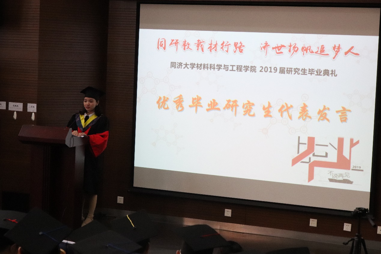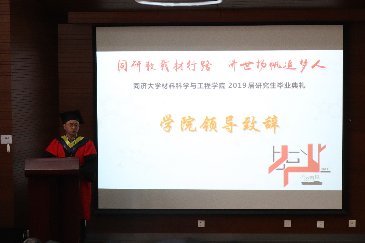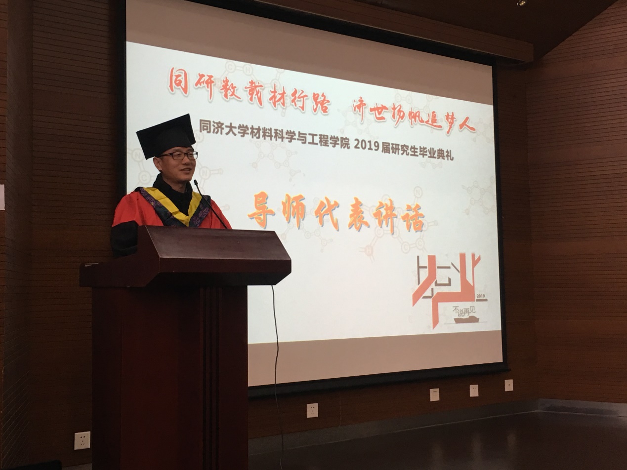 学科委员会主任黄云辉致辞,他对全体毕业研究生致以最美好的祝福,有感于同学们数年年坚持的不懈努力,欣慰于同学们终于成长为于国于家有望的人,黄老师同时也向提出了几点希冀,希望毕业生能够牢记知行合一的行事宗旨,在未来的工作生活中真正的践行“仰望星空,脚踏实地”的信念,并牢记同济大学“同心同德同舟楫,济世济人济天下”的校训,做一个团结友爱,同心同德,富有教养的人。最后,黄云辉嘱托毕业学子,一定要秉承着“穷则独善其身,达则兼济天下”的伟大梦想,为中华民族的伟大复兴贡献出自己的力量。