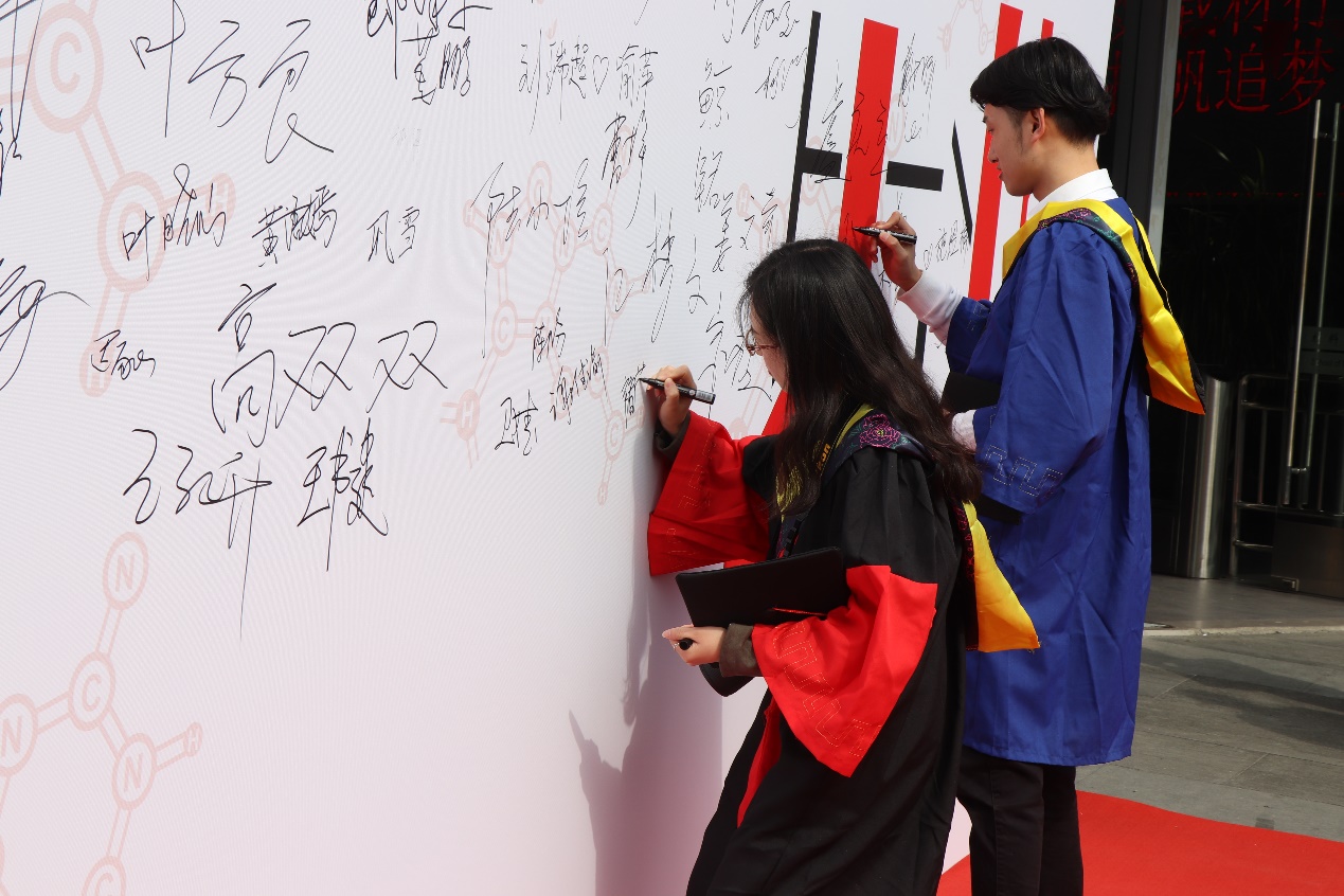典礼前,德才馆门前的红毯与签名墙,无不代表者母校对于毕业生的不舍依恋毕业生的不舍与依恋;报告厅中,同学们携手同窗同门,抑或爱人父母,志得意满地前行。大家也纷纷在签名墙上写下自己的名字,还有对竞彩足球比分