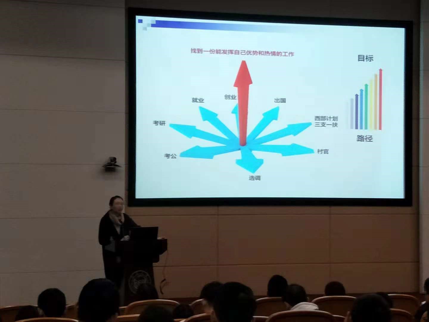 其次方雅静老师就目前的就业形势为大家进行深入剖析。虽然受到中美贸易摩擦的影响,今年毕业生就业形势稍逊于往年,但仍然有非常多的岗位供大家选择。方雅静老师强调,现在是大数据时代,互联网和人工智能是大趋势,同学们应认真解读国家出台的相关政策,从宏观上把握就业趋势,同时参考往届学长学姐的就业去向,慎重选择职业。