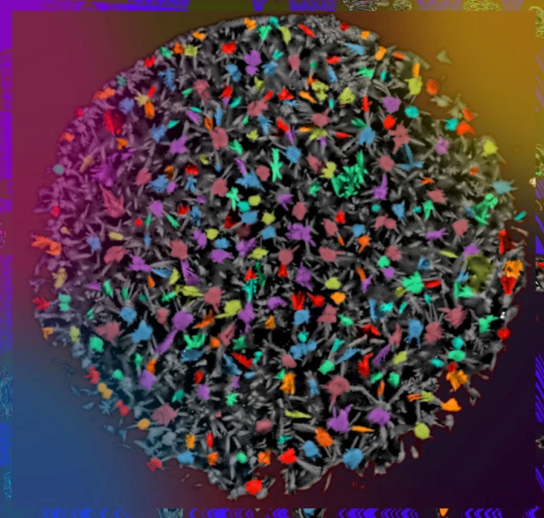 作品介绍:此图经过PS软件修饰处理后,并没有认为增添或减少原图中的拍摄内容。原图中点状的共晶组织被染上了红色、黄色、紫色、粉色和蓝色等颜色,将背景用画笔渲染得带有迷幻色彩,并用滤镜为图片加框,在保留原汁原味的基础上,使原始的粉末和其后的黑色背景浑然一体。中间的圆形像一簇色彩斑斓的花束,我将它命名为“万花筒”,既符合它的视觉感官效果,也希望能够为看到它的人带去一份喜悦之情。