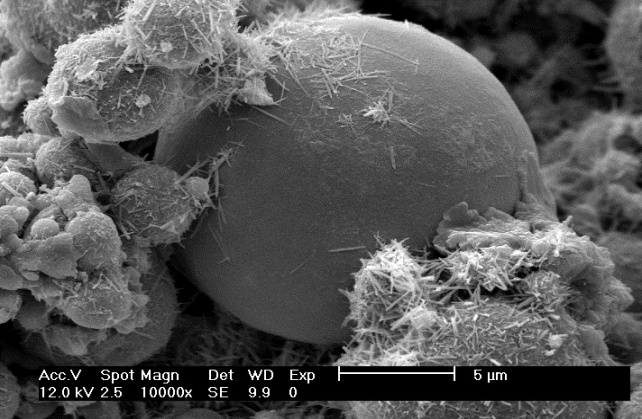材料介绍:原图中,球是粉煤灰颗粒,旁边针状物说水化反应生成物的钙矾石等水化产物。这是掺有粉煤灰的水泥早期水化的电镜图,图中粉煤灰颗粒未水化,表面有水化产物附着。