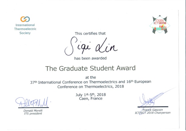 2019届直博研究生林思琪也将自己青春献给了科研,做人之不愿做,行人之不敢行,立足基础,终于厚积薄发。林思琪在实验室从小事做起,也坚信所有科学问题都源于最简的开始。她搜集了现有报道的所有热电材料的热导率及声子结构的信息,并发现低声速、低声学截止频率等有效实现低晶格热导率的指导思路,以此开发了晶格热导率低如木头的硫银锗矿材料。五年的博士生涯,她发表SCI论文31篇热电论文,第一/通讯作者论文7篇,其中包括Cell姊妹刊和Nature子刊2篇。鉴于在热电研究的成果和贡献,被国际热电学会授予2018 ITS Graduate Student(每年遴选2名博士生)和ICT Best Poster等国际荣誉奖项。而今,博士毕业的她选择了在同济大学继续自己的科研生涯。