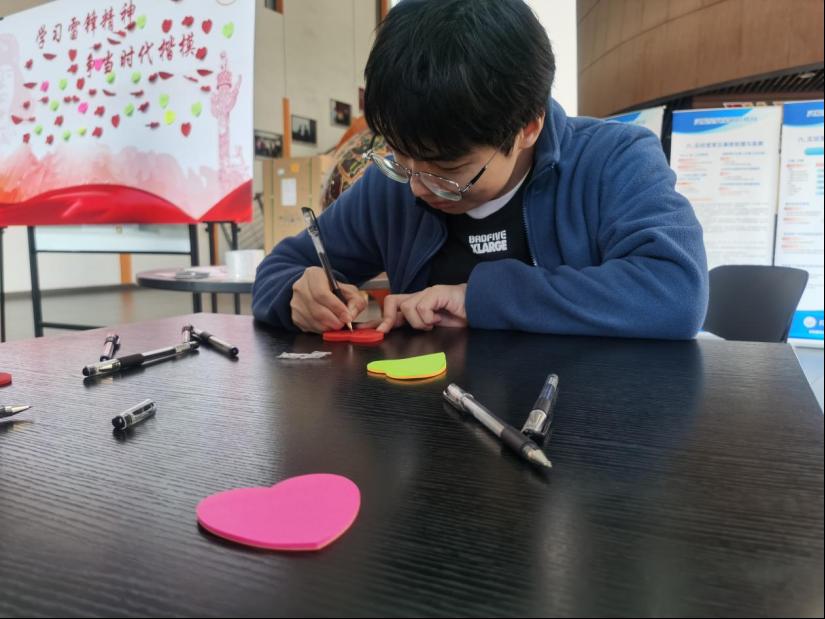 师生在五彩缤纷的便签纸上记录身边的“活雷锋”,书写对于雷锋精神的深刻感悟,并郑重地张贴在展板进行展示,描绘了一幅幅温馨感人的互助情景,以此传递爱心善意,分享点滴感动。
