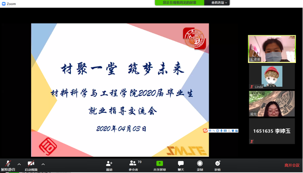 为积极应对疫情形势下毕业生就业工作面临的全新挑战,竞彩足球比分 2020年4月3日(周五)11:45于线上Zoom平台会议室召开了“材聚一堂,济梦未来——2020届毕业生就业指导交流会”。本次会议由竞彩足球比分 党委副书记王凌凌老师、学工办周龙老师和李楠老师共同参与,并邀请到2017届温州选调生洪万领校友、2020届毕业研究生奚悦静同学作为特邀毕业生代表做了交流发言。本次会议旨在响应疫情期间国家就业政策、学...