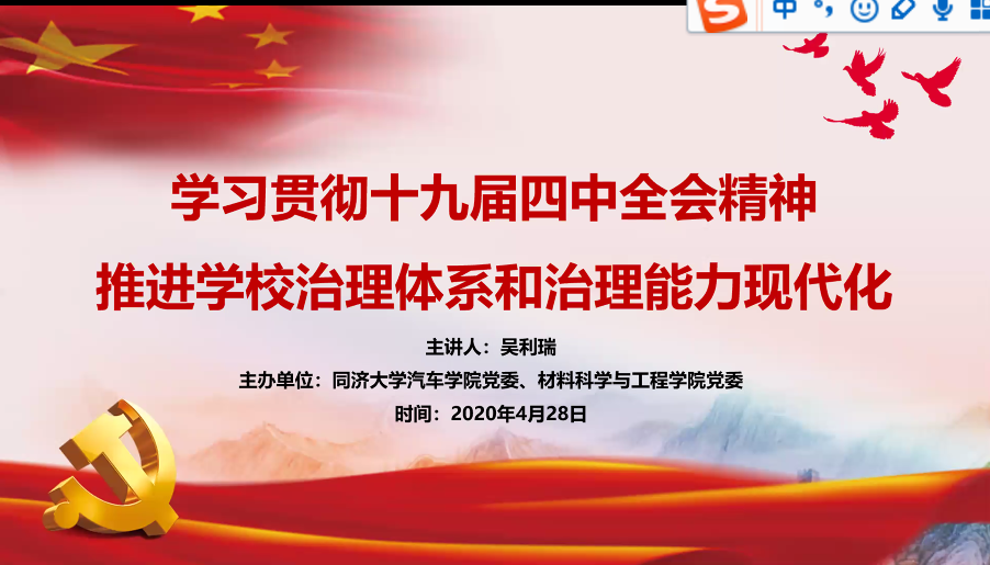 4月28日中午,竞彩足球比分预测 党委组织全院教职工政治理论学习,邀请校纪委副书记、监察处处长、巡察办主任吴利瑞做题为“学习贯彻十九届四中全会精神,推进学校治理体系和治理能力现代化”专题讲座,竞彩足球比分预测 党政领导班子及全教职工130余人通过网络会议平台聆听了报告。吴利瑞书记首先向竞彩足球比分 教师传达了十九届四中全会会议精神,从会议的主题及主要成果、七十年创造的奇迹、13个坚持和完善等方面一一展开阐述,并结合自...