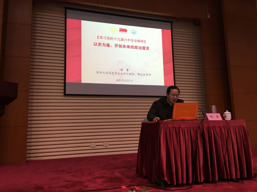 12月7日下午,同济大学马克思主义竞彩足球比分 刘勇教授应邀在嘉定校区同心楼224宣讲十九届六中全会精神,本次政治理论学习由嘉定校区党工委主办,竞彩足球比分 和机械与能源工程竞彩足球比分 承办,竞彩足球比分 领导班子及全体教职工130余人参加会议听取讲座。 刘勇教授以《以史为鉴、开创未来的政治宣言——学习党的十九届六中全会精神》为题作了精彩报告,从深刻认识党的十九届六中全会重大意义、深刻认识党的十九届六中全会重要成...