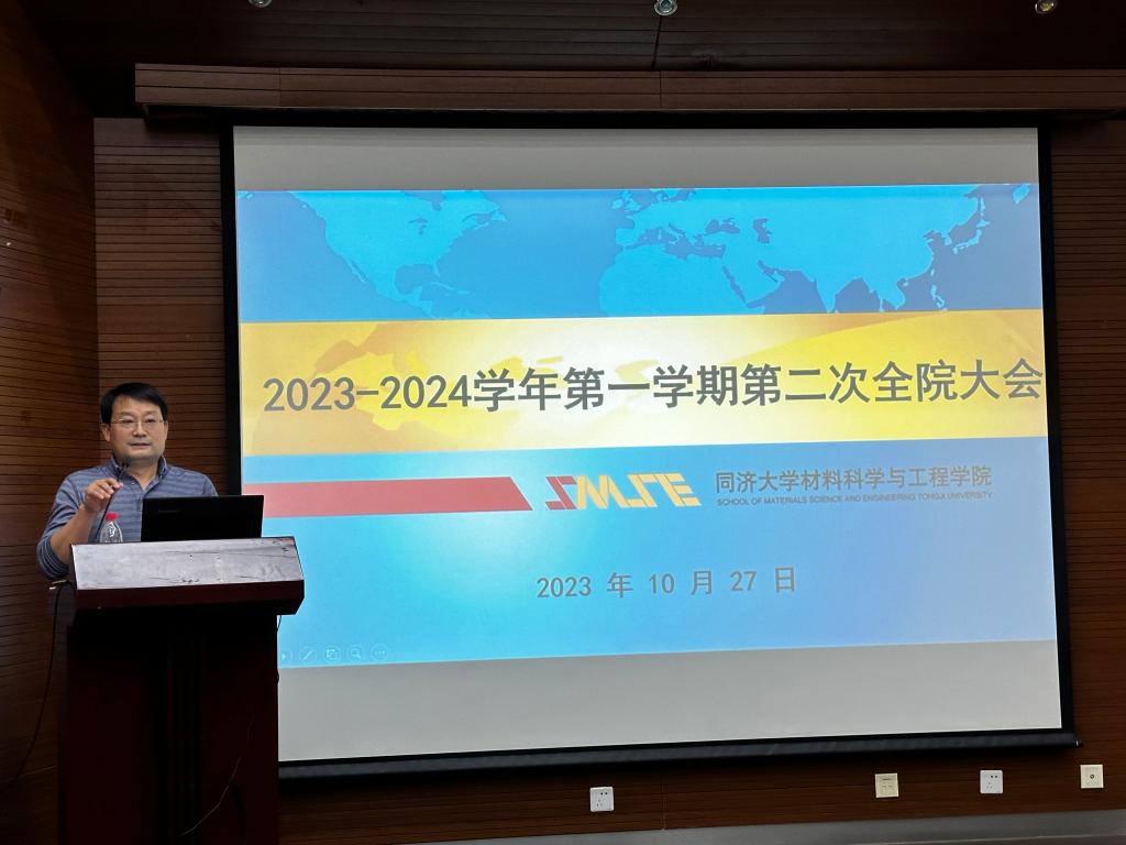 2023年10月27日下午,竞彩足球比分 2023-2024学年第一学期第二次全院大会在嘉定校区德才馆报告厅召开。会议由蒋正武副院长主持,全院100余名教职工参加了本次会议。会议伊始,竞彩足球比分 党委书记杨晓杰代表竞彩足球比分 领导班子,做硕博学位点专项核验及材料科学与工程专业工程教育认证工作动员讲话。随后,蒋正武副院长介绍了材料与化工专业硕博学位点专项核验工作及材料科学与工程专业工程教育认证专家线上考查工作的相关背景,并就上...